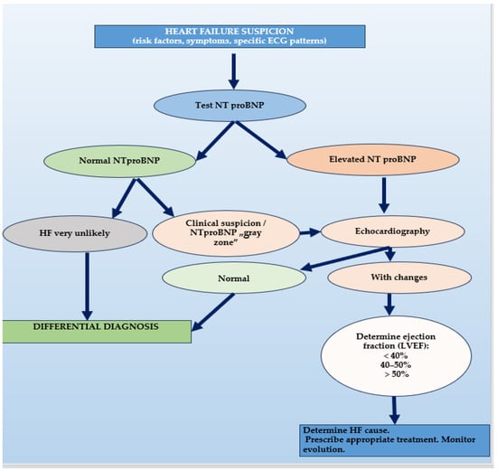 - Bayes-Genis, A.; Docherty, K.F.; Petrie, M.C.; Januzzi, J.L.; Mueller, C.; Anderson, L.; Bozkurt, B.; Butler, J.; Chioncel, O.; Cleland, J.G.F.; et al. Practical Algorithms for Early Diagnosis of Heart Failure and Heart Stress Using NT-proBNP: A Clinical Consensus Statement from the Heart Failure Association of the ESC. Eur. J. Heart Fail. 2023, 25, 1891–1898. [Google Scholar] [CrossRef]