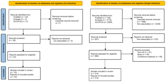 Melioidosis coinfection studies refer to studies investigating the impact of additional infections on melioidosis mortality. The search process identified a total of 37 records from three databases: PubMed (n = 32), Embase (n = 2), and SCOPUS (n = 3). After one duplicate record was removed, 36 studies were screened, and 4 studies were excluded because of nonassociation. This screening led to 32 reports being assessed for eligibility. All 32 studies were deemed eligible and were included in the systematic review and meta-analysis. In contrast, single-infection studies focus on melioidosis without any additional coinfections, serving as a baseline for comparison. A total of 5448 records were identified across PubMed (n = 748), Embase (n = 2115), and SCOPUS (n = 2585). After removing 1568 duplicate records and 3229 unrelated to the topic, 651 records were eligible for screening (the references are in Supplementary File S1). Next, 81 nonfull reports, 45 books, and 58 conference abstracts were excluded, leaving 498 reports for eligibility assessment. Among these, 314 studies were included in the systematic review and meta-analysis, as shown in the PRISMA flow (Figure 1).