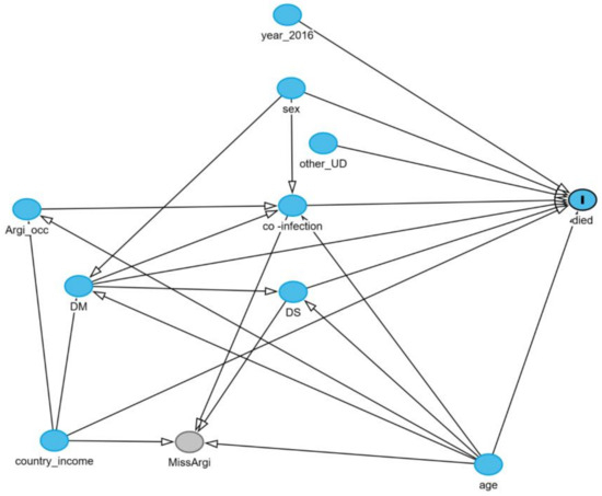 Seven prognostic models were assessed for sensitivity analysis via multiple imputations (MI) in Table 3. Two of seven models, including socioeconomic country status and age groups, exhibited an association with death similar to that of the complete case analysis (CCA). Three models, including DM, other underlying and types of infection, were associated with death at higher risk. While agricultural occupation and the dissemination of disease exhibited an association with death at lower risk than CCA. The conceptual causal diagram of the study is shown in Figure 2. Overall, the sensitivity analysis based on multiple imputations revealed slight differences in the magnitude of association and confidence interval width for these prognostic factors. The conclusions of the causal associations remained the same (Table 3).