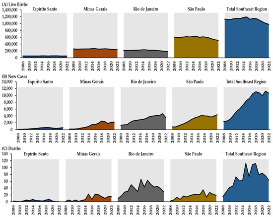 This is an epidemiological study, with an ecological design, of the time-series type, based on secondary data from SC in children under one year old in the states of Brazil’s Southeast Region between 2008 and 2022. Information on the number of live births, new cases, and deaths from CS was obtained for Brazil’s Southeast Region. This region is the most populous in the country, with 84,840,113 inhabitants and a population density of 9176 inhabitants/km2 [23]. It comprises the states of Espírito Santo, Minas Gerais, Rio de Janeiro, and São Paulo, which are among the ten states with the highest Human Development Indexes in the country [24].