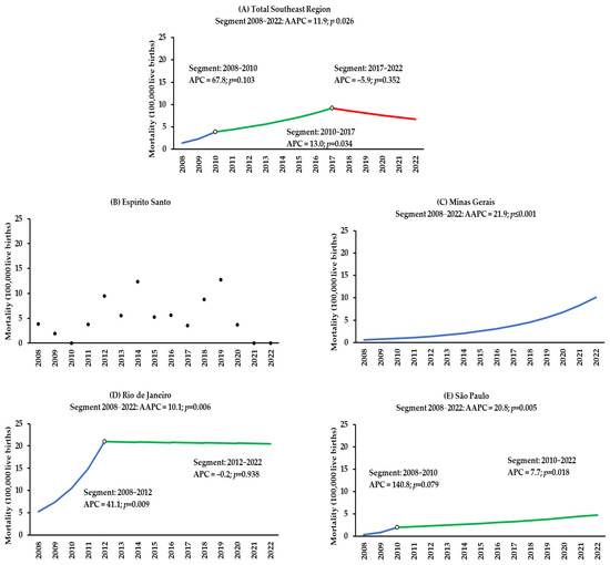 Temporal trend of congenital syphilis mortality in children under one year of age in Brazil’s Southeast Region (A) and the states of Espírito Santo (B), Minas Gerais (C), Rio de Janeiro (D), and São Paulo (E) from 2008 to 2022.