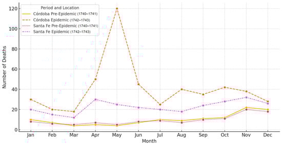 Monthly mortality trends are visualized in Figure 1, which highlights the sharp seasonal mortality peak in Córdoba during the epidemic. While the figure does not illustrate spatial dissemination, it reflects the intensity and timing of the outbreak in urban centers along the Royal Road.