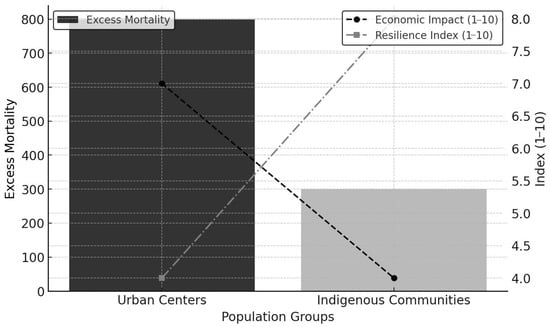 Comparative impact of the 1742–1743 epidemic on urban centers and Indigenous populations. The figure illustrates disparities in excess mortality (bars), economic disruption (dashed lines), and resilience. Urban centers experienced higher mortality and greater disruption, whereas Indigenous communities showed lower mortality and relatively greater recovery capacity.