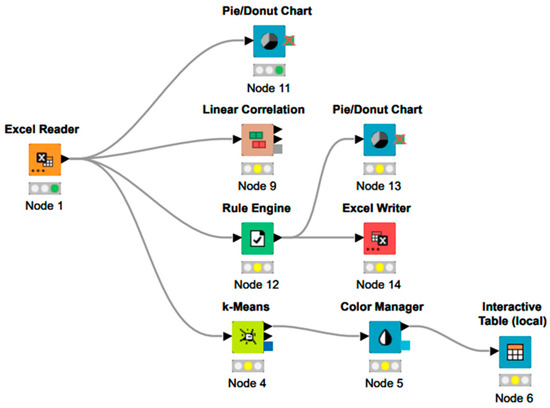The data analysis was conducted using KNIME software (version 4.7.1), where we performed clustering and generated graphical representations of the results. We constructed a workflow for this analysis. This workflow is shown in Figure 1. We performed clustering of similar data and produced graphical and statistical measures of the data analysis. Pearson’s correlation coefficient and p-value statistical significance coefficient were calculated using the KNIME software.