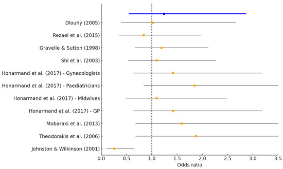 In the results of the meta-analysis, before the sensitivity analysis, the overall average odds ratio is 1.24020 (CI: 0.54–2.86). We conducted a sensitivity analysis by removing the study of [7], as it did not meet the criteria: it was authored by a single writer, not indexed in PubMed and Scopus databases, and used no-adjusted indicators. After this, the overall average odds ratio was adjusted to 1.26240 (CI: 0.56–2.89). A second sensitivity analysis was performed by further removing five studies that were checked against less stringent criteria for the use of adjusted indicators, resulting in an overall average odds ratio of 0.72306 (CI: 0.38–1.38).
