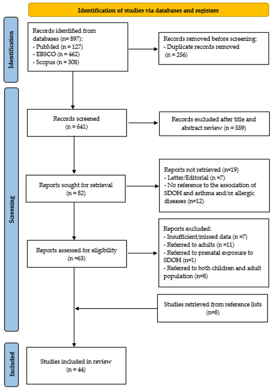 We excluded studies that did not assess SDOHs concerning asthma and/or allergic diseases or had insufficient data; studies focusing exclusively on adults or mixed adult and pediatric populations; studies that included social variables exclusively as confounders without presenting their associations; and case reports, case series, reviews, systematic reviews, or meta-analyses.