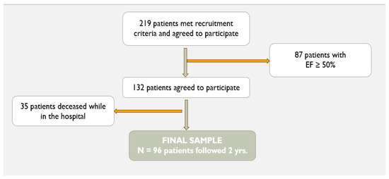 Participants were patients admitted to the Cardiology Clinic of the Elias Emergency University Hospital in Bucharest, Romania between March 2020 and October 2021. Initial inclusion criteria were: patients who presented to the hospital with signs and symptoms characteristic of HF (particularly acute dyspnea of cardiac origin), who had NT-proBNP at admission >250 pg/mL, and were able to comprehend the information regarding the study. Exclusion criteria were: patients with other conditions that could cause shortness of breath (e.g., pathological changes on the chest X-ray that led to the diagnosis of pneumonia or other lung diseases) or a diagnosis of chronic pulmonary diseases (asthma or COPD), or other conditions that could cause a rise in serum NT-proBNP concentrations (i.e., acute coronary syndromes, acute pulmonary embolism, pericardial constriction and obstructive hypertrophic cardiomyopathy, severe left heart valve disease, chronic kidney disease stage 4 or 5). This initial sample was reduced because 35 patients died in the hospital. Also, patients with preserved ejection fraction (i.e., LVEF ≥ 50%) (N = 87) were not included in the statistical analyses, given that this study focused on patients with LVEF < 50%. The final sample consisted of N = 96 patients who already had a diagnosis of HF with LVEF < 50%. Steps for participant selection are illustrated in Figure 1.