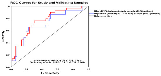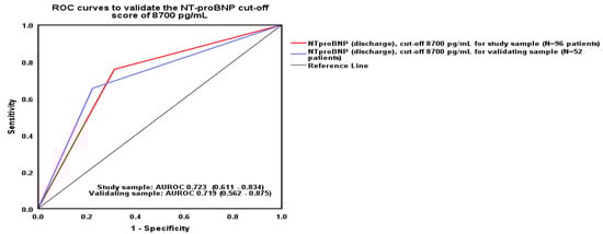 The ROC curves predicting the two-year mortality from NT-proBNP values at hospital discharge.