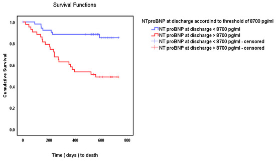 From among the 53 patients with NT-proBNP lower than the proposed cut-off score of 8700 pg/mL, 46 survived and 7 died. From among the 43 patients with NT-proBNP higher than 8700 pg/mL, 22 died and 21 survived (χ2 = 16.66, p < 0.001).