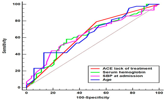 Survival analysis estimates were computed for the variables found to be predictors of NT-proBNP over 8700 pg/mL (i.e., age, SBP, no ACE-I treatment, and serum HB). Statistically significant results were obtained for age > 82 years old, OR 4.73 (95% CI [1.74–12.85], p = 0.002); systolic blood pressure (SBP) at admission ≤ 120 mmHg, OR 3.4 (95% CI [1.36–8.49], p = 0.009); lack of ACE-I treatment, OR 0.3 (95% CI [0.12–0.74], p = 0.009), and serum hemoglobin (HB) at admission ≤ 11.7 g/d, OR 3.2 (95% CI [1.38–7.46], p = 0.007). Figure 5 depicts the ROC curves for patients based on the variables.