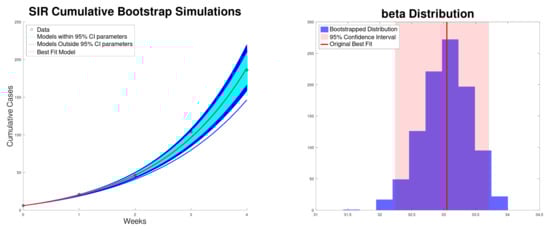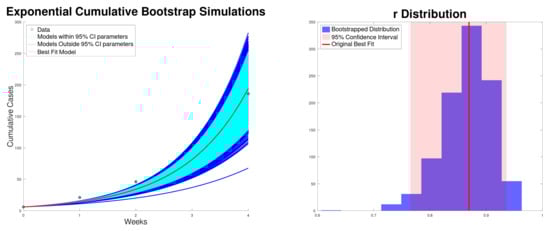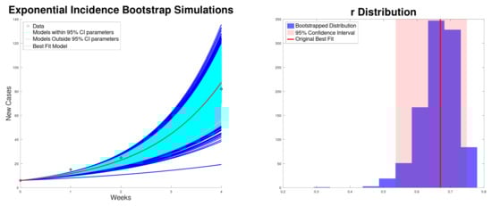 Figure 1 shows the best fit to the new cases, along with the 95% confidence interval of the exponential growth model (2) of the Texas–New Mexico measles 2025 outbreak. The confidence intervals are computed using bootstrapping [,]. In addition, it shows the histogram for the exponential growth rate r. On the other hand, Figure 2 shows the best fit to cumulative cases, along with the 95% confidence interval and the distribution of the exponential growth rate r. As expected, the exponential growth rate r obtained when fitting the cumulative data is larger than the one obtained when fitting new cases [,]. This is due to the fact that in the exponential model the recovered cases are not taken into account and therefore r can be inflated.