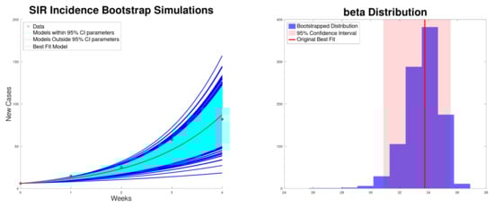where is the mean of the gamma distribution. Now, using a mean of 11 days and variance of 5 day for the gamma distribution, we can obtain the estimated effective reproduction number since we estimate the value of the growth rate r. However, if we use a mean of 14 days, the basic reproduction number increases to 57.9. On the other hand, if we reduce the mean of the gamma distribution , the basic reproduction number (using Equations (10) and (8)) decreases below 31 and 40 for the incidence and cumulative fits. Thus, despite some uncertainty in the parameters, we still obtain results that agree well with previous results [,].
