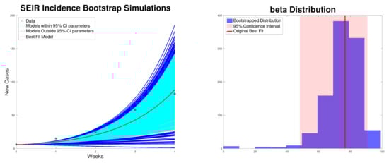 Best fit of the new cases, along with the 95% confidence interval (bootstrapping) of the SEIR model (5) to the Texas–New Mexico measles 2025 outbreak (left). Bootstrapping distribution of the transmission rate with the 95% confidence interval (right).