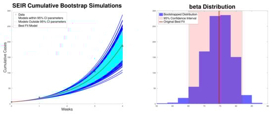 Best fit of the cumulative cases, along with the 95% confidence interval (bootstrapping) of the SEIR model (5) to the Texas–New Mexico measles 2025 outbreak (left). Bootstrapping distribution of the transmission rate with the 95% confidence interval (right).