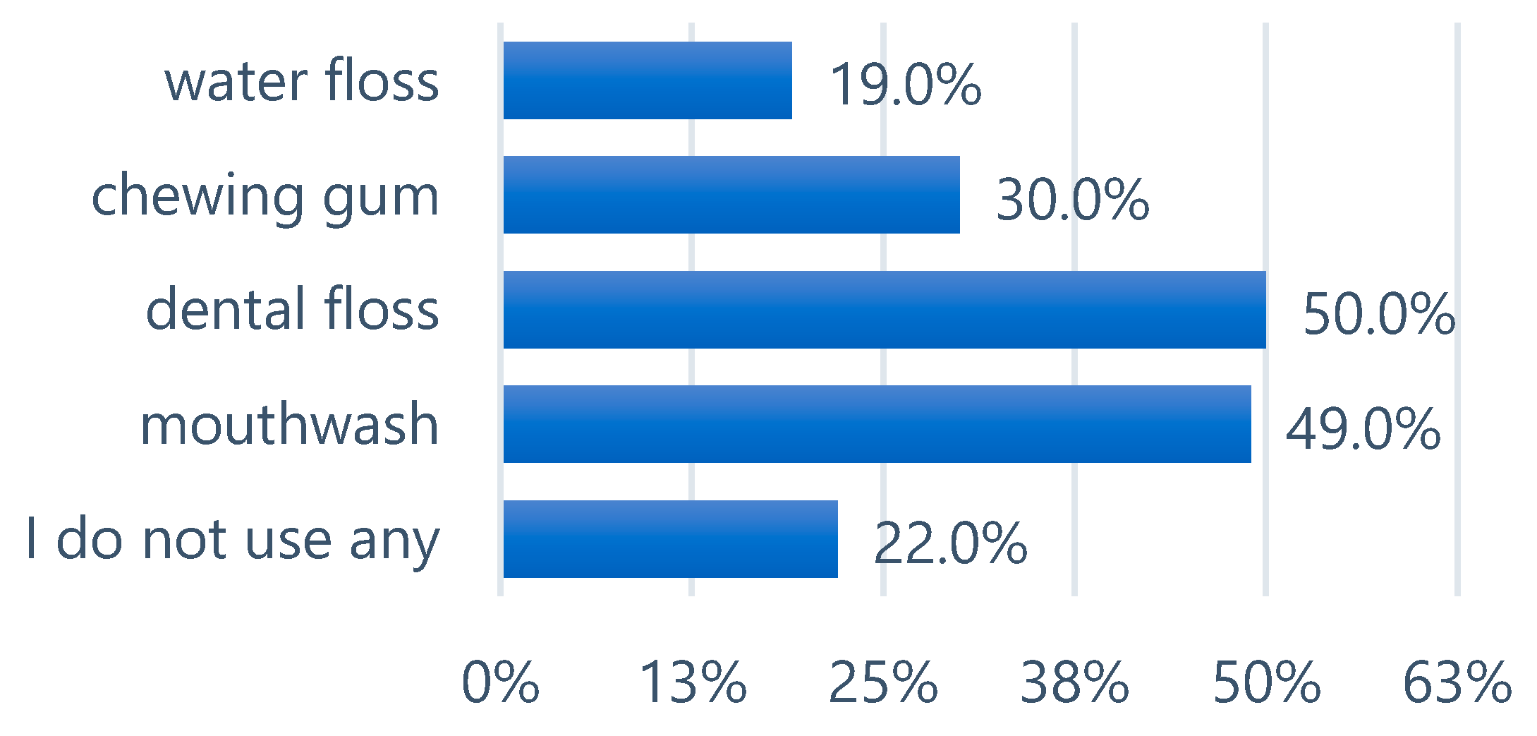 - Pinzan-Vercelino, C.; Freitas, K.; Girão, V.; da Silva, D.; Peloso, R.; Pinzan, A. Does the Use of Face Masks during the COVID-19 Pandemic Impact on Oral Hygiene Habits, Oral Conditions, Reasons to Seek Dental Care and Esthetic Concerns? J. Clin. Exp. Dent. 2021, 13, e369–e375. [Google Scholar] [CrossRef] [PubMed]