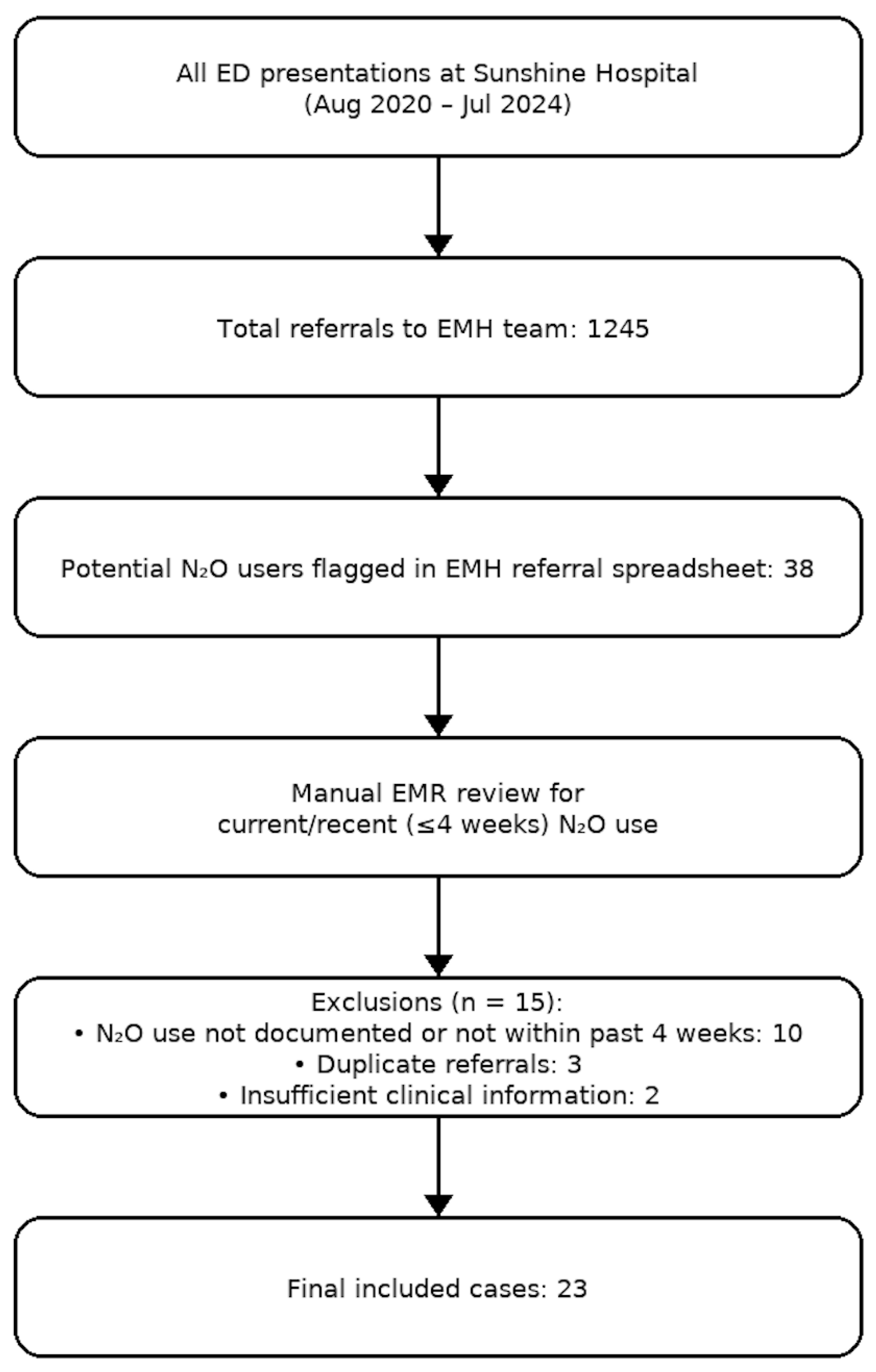 - Severity classification: presentations were categorized as acute (≤7 days from N2O use), subacute (8–30 days), or chronic (>30 days or repeated exposure).