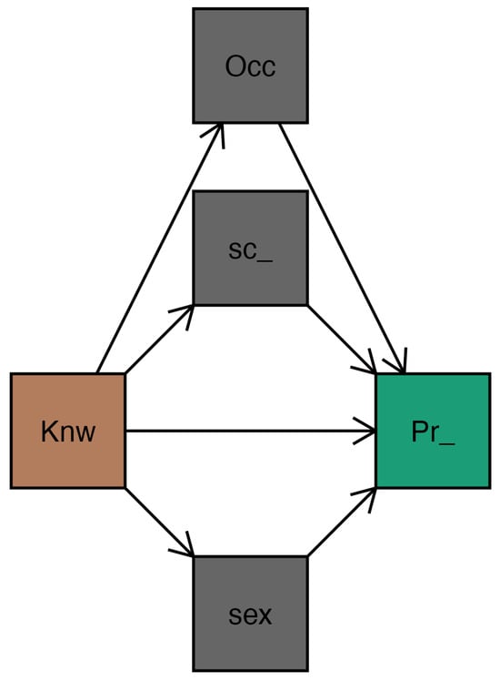 This research employed a cross-sectional, quantitative design to examine associations between knowledge, preventive practices, and sociodemographic factors among MDR-TB patients. Understanding how knowledge relates to preventive practices in multidrug-resistant tuberculosis requires rigorous analysis of the factors associated with its adoption. To examine how knowledge may be associated with preventive practices, an empirical evaluation was implemented, following the methodological recommendations established in the literature for research on health behaviors in patient populations []. The analytical framework utilized path analysis to evaluate direct associations and potential indirect pathways through which sociodemographic variables may be linked to the knowledge-practice relationship. Path coefficients were calculated to quantify the strength and direction of associations, where direct effects represent the unmediated relationship between knowledge and preventive practices, while indirect pathways capture associations that operate through sociodemographic variables (occupation, educational level, and sex). This approach allows for the simultaneous estimation of multiple pathways and provides standardized coefficients that facilitate the interpretation of effect sizes across different variables, ensuring a comprehensive understanding of the complex associations between knowledge, sociodemographic factors, and preventive behaviors in the MDR-TB context. We emphasize that the cross-sectional design precludes causal inference; observed associations reflect correlational patterns rather than directional or causal relationships.
