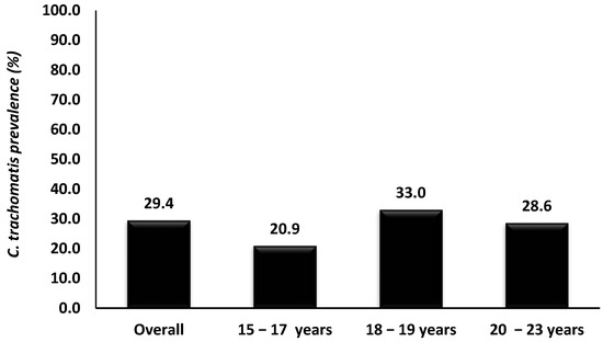 The study participants’ characteristics have been previously described elsewhere [5,21]. The overall prevalence of Chlamydia trachomatis among AGYW in the Eastern Cape Province was 29.4% (63/214, Figure 2). No significant associations were observed between C. trachomatis prevalence and the demographic or behavioral factors assessed, including age, HIV status, or sexual behaviors (Table 1).