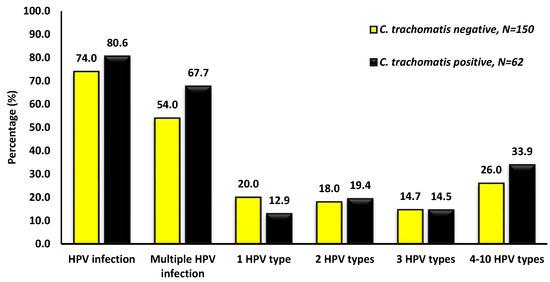 - Lu, Y.; Wu, Q.; Wang, L.; Ji, L. Chlamydia trachomatis enhances HPV persistence through immune modulation. BMC Infect. Dis. 2024, 24, 229. [Google Scholar] [CrossRef] [PubMed]