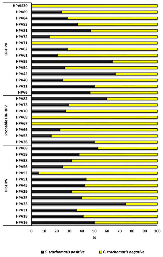 - Seraceni, S.; Campisciano, G.; Contini, C.; Comar, M. HPV genotypes distribution in Chlamydia trachomatis co-infection in a large cohort of women from north-east Italy. J. Med. Microbiol. 2016, 65, 406–413. [Google Scholar] [CrossRef]