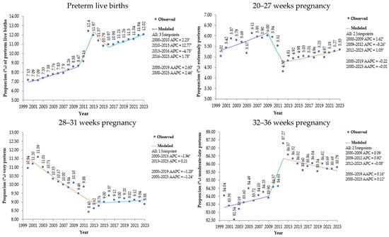 The average annual percentage change (AAPC) confirmed a statistically significant increasing trend for preterm births both in the period prior to the COVID-19 pandemic (2000–2019) (AAPC: 2.60; p < 0.0001) and in the period including the pandemic (2000–2023) (AAPC: 2.46; p < 0.0001).