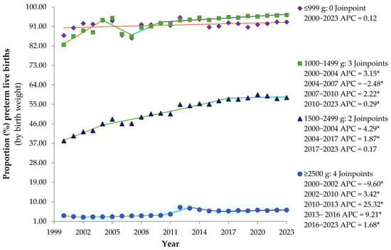Preterm infants with birth weights between 500 and 999 g showed four trend segments between 2000 and 2023: from 2000 to 2004, with an APC of 1.88 (95% CI: 1.36; 3.00), p < 0.0001, a decrease from 2004 to 2007 [APC of −1.67 (95% CI: −2.36; −0.59), p = 0.0016], a greater increase from 2007 to 2010 [APC of 1.84 (95% CI: 0.88; 2.44), p = 0.0012], and remained stable from 2010 to 2023, p = 0.1587.