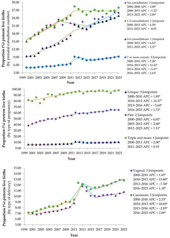 Analysis by annual percentage change (APC) identified four segments of interrupted trends for preterm live births, all with statistical significance: the 2000–2010 period showed an increasing trend (APC: 2.23; p = 0.0008); the 2010–2013 period demonstrated an accelerated growth (APC: 12.77; p = 0.0008); the 2013–2016 period showed a trend reversal with a decline (APC: −4.75; p = 0.0024); and the 2016–2023 period indicated a resumption of growth (APC: 1.78; p < 0.0001).