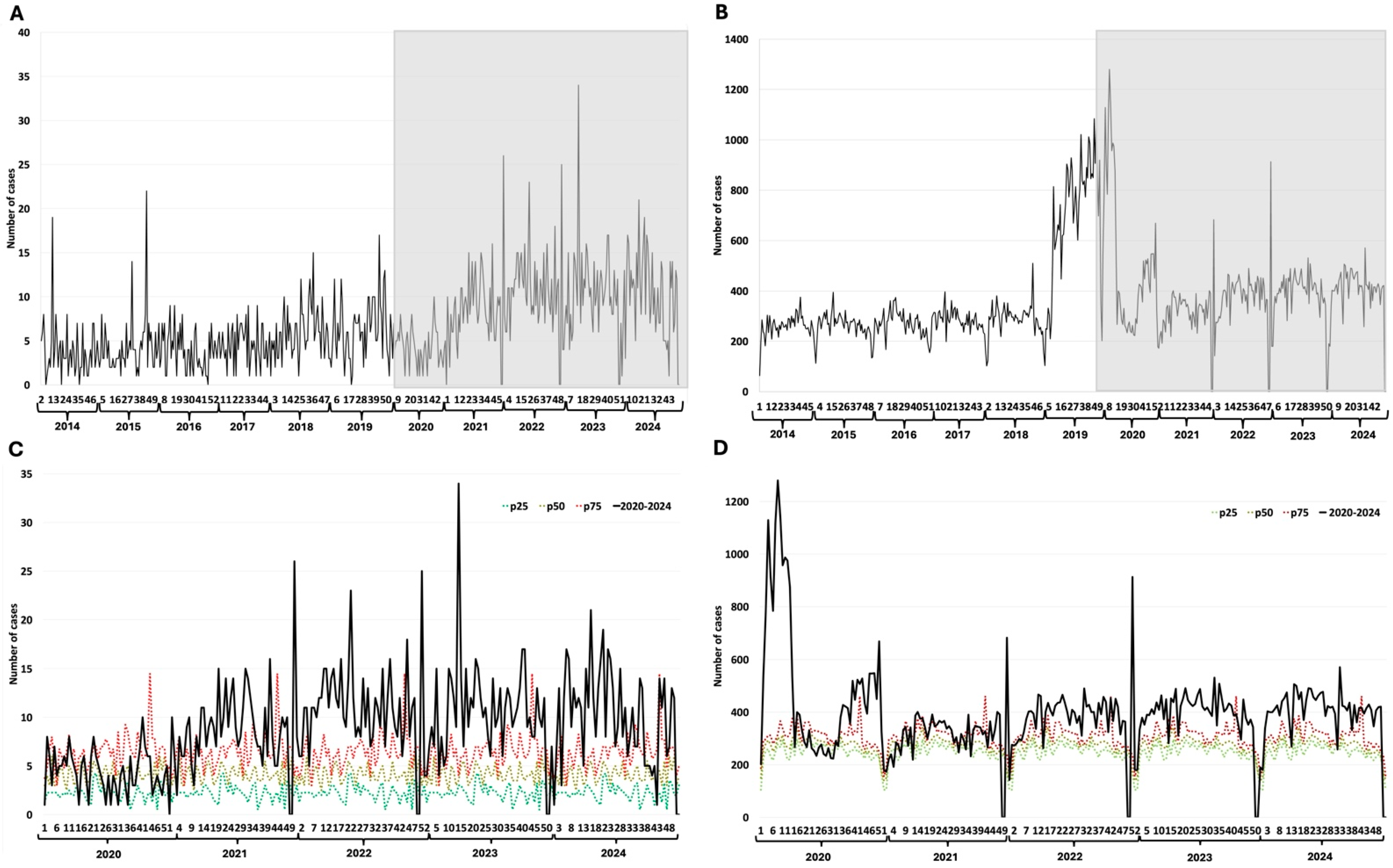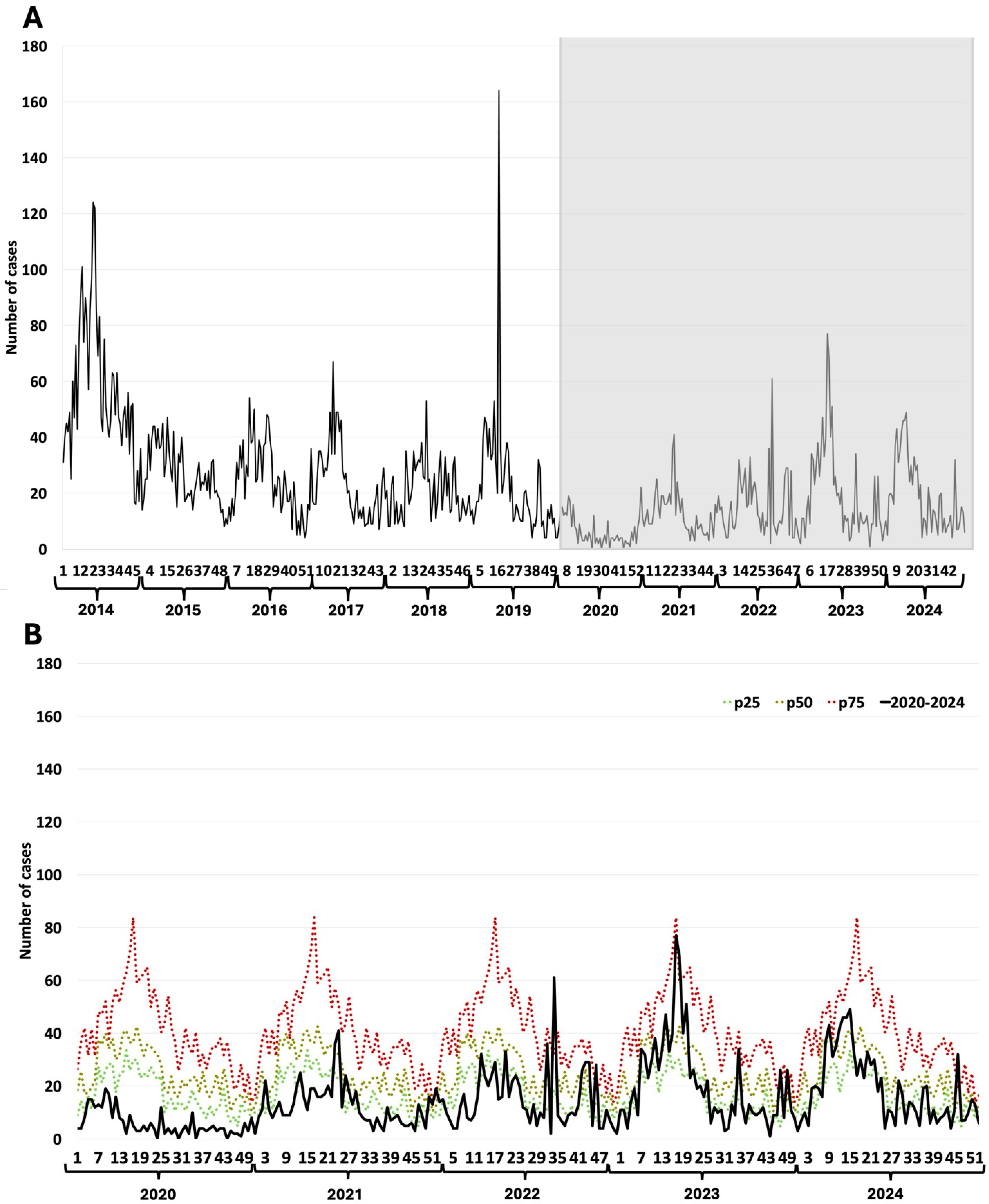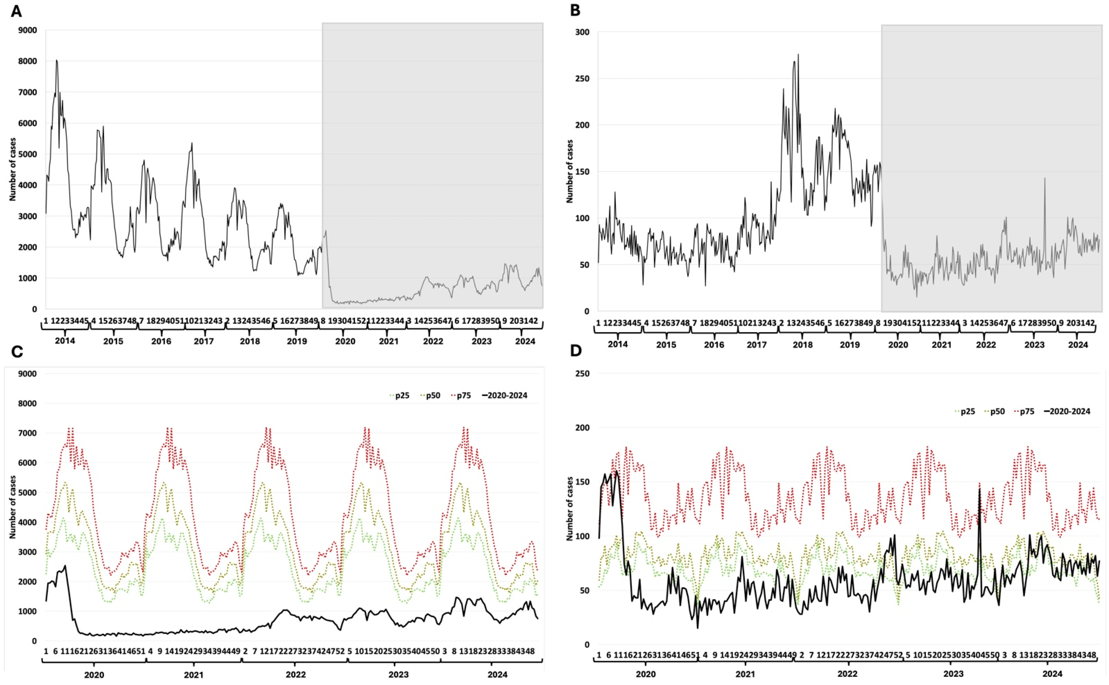 | Disease | Weekly Median Cases (2014–2019) | Weekly Median Cases (2020–2024) | Total Excess or Deficit (2020–2024) | % Change (2020–2024) |