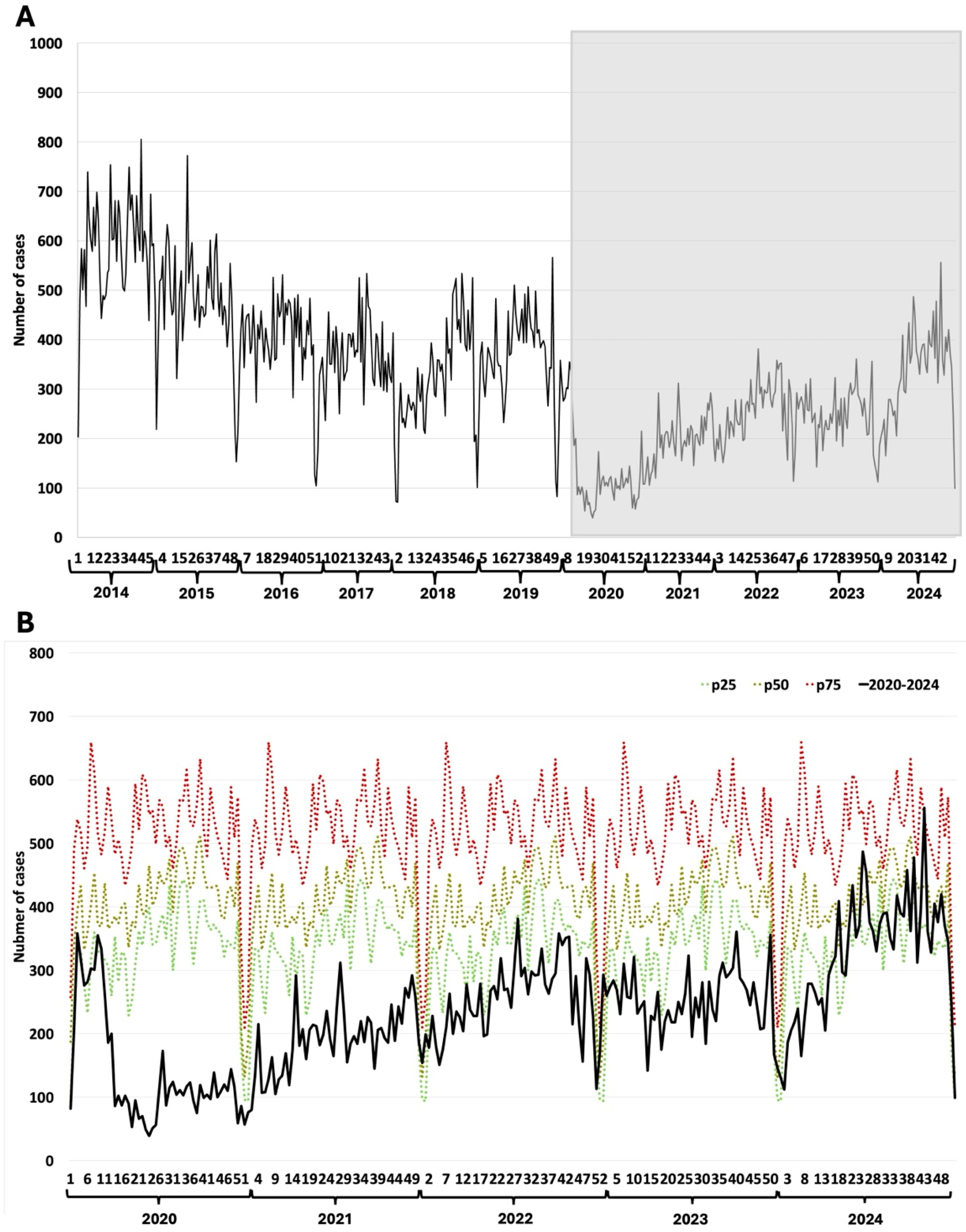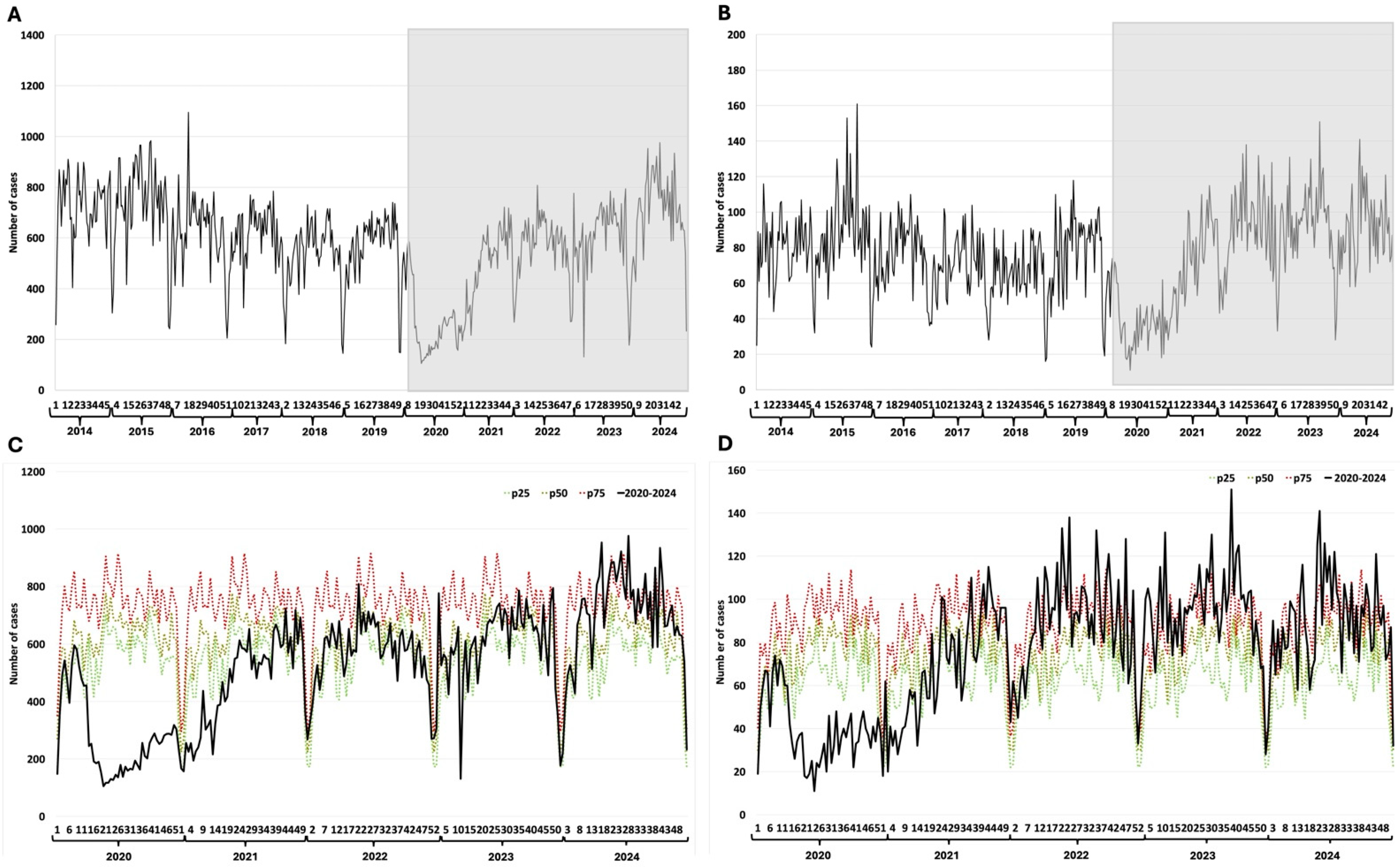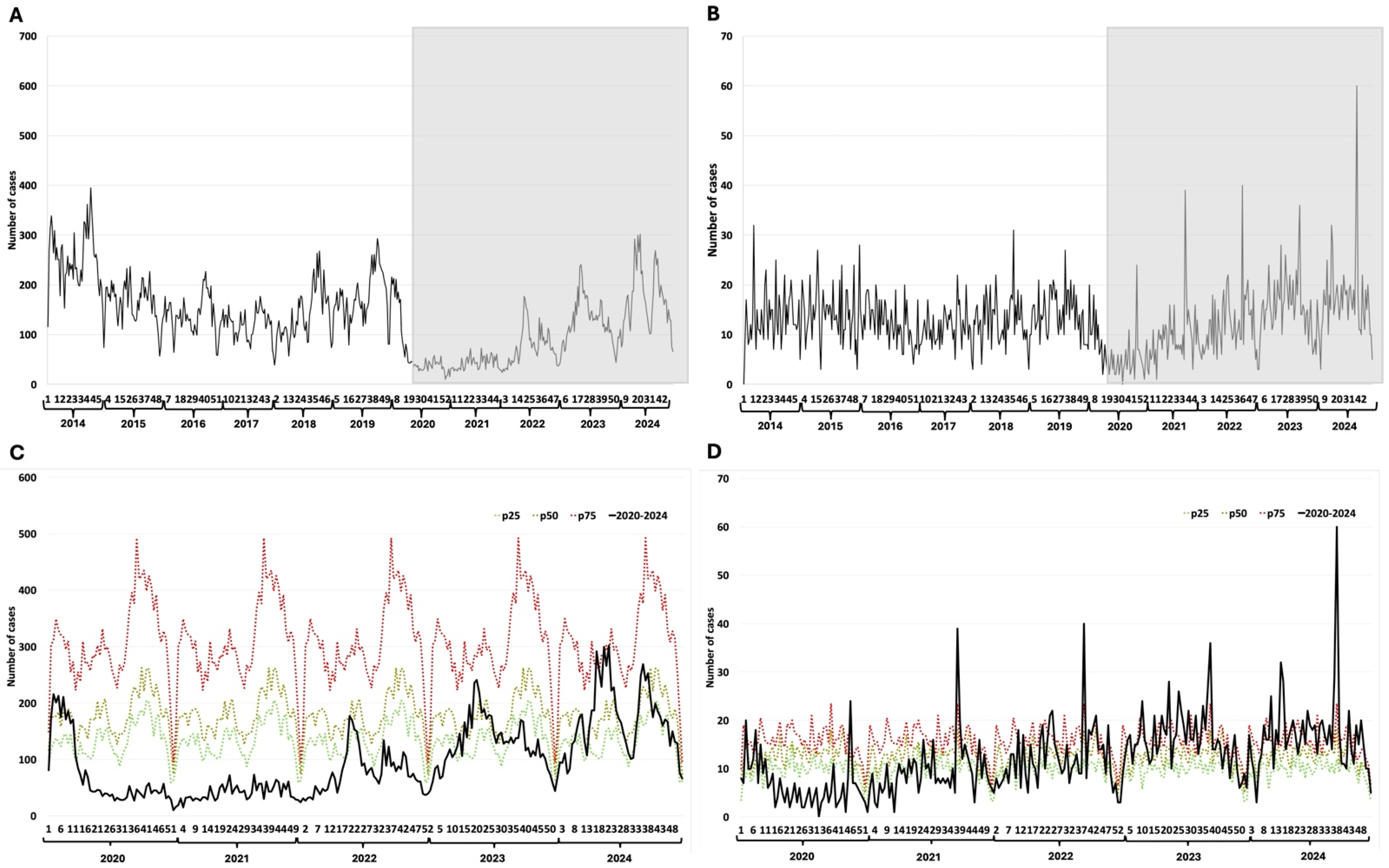 | Disease | Weekly Median Cases (2014–2019) | Weekly Median Cases (2020–2024) | Total Excess or Deficit (2020–2024) | % Change (2020–2024) |