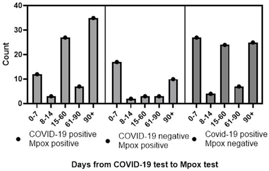 Similar observations were made when we compared the SARS-CoV-2+ MPXV+ group to the SARS-CoV-2+ MPXV− group (mean 99 days between tests vs. mean 63, statistically significant difference tested continuously at the p < 0.01 level, and dichotomously different with OR = 0.4, 95% CI = 0.2–0.8, p < 0.01 level).