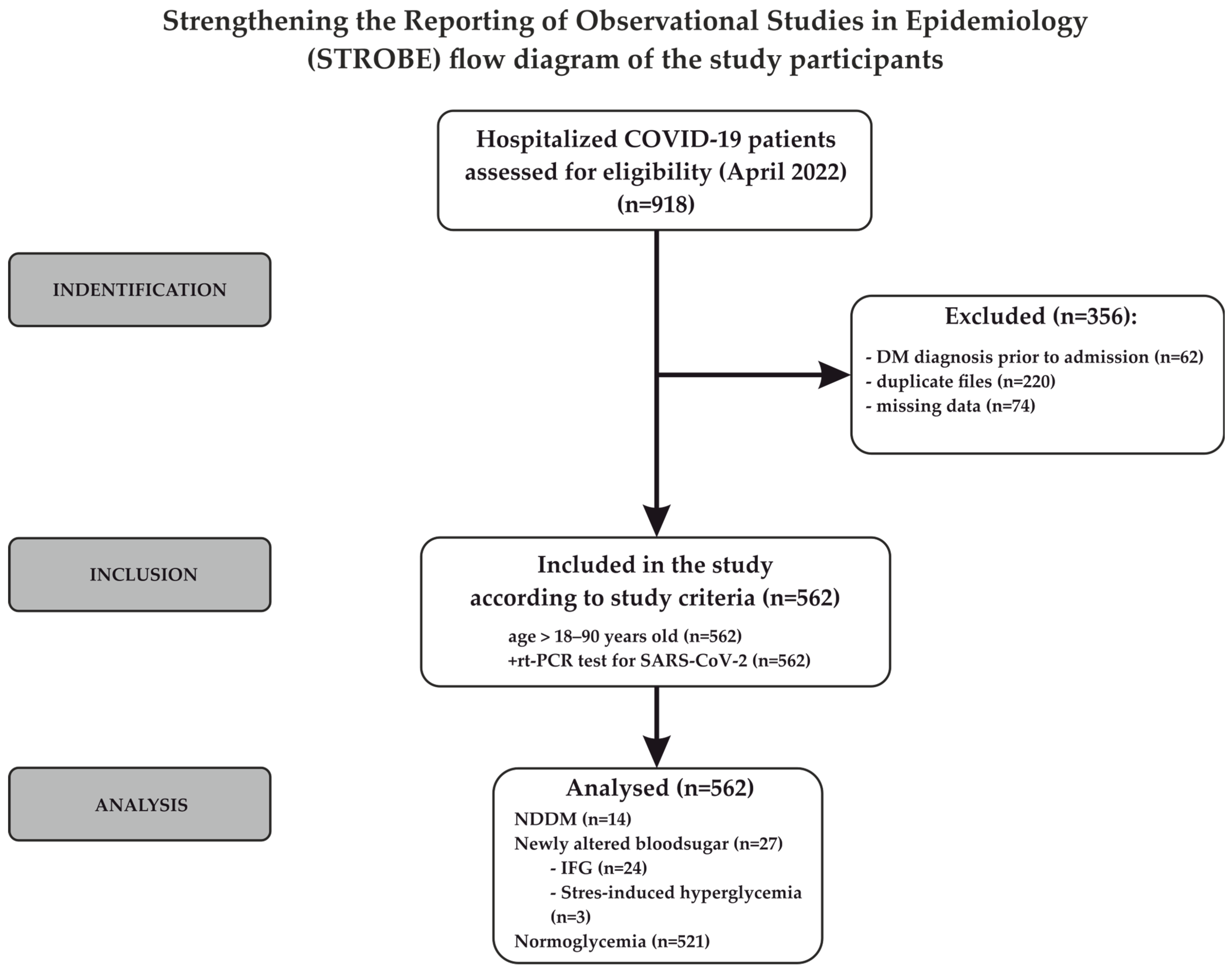 No formal sample size calculation was performed, as the study included all eligible patients identified from the hospital registry. A total of 918 patients were initially identified. After applying predefined exclusion criteria (previous diagnosis of diabetes mellitus, duplicate records, and incomplete clinical or laboratory data), 562 patients were included in the final analysis. The selection of study participants is illustrated in the STROBE flow diagram, created using CorelDRAW (Version 24.0.0.301, 2021) (