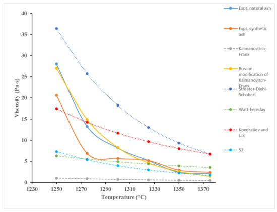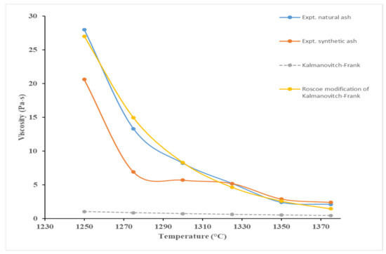 In addition, predicting the viscosity of petcoke slag can be more complex than for coal slag due to the presence of vanadium. Its behaviour at different oxidations states and interactions with other slag constituents is not completely understood in the literature. Oxidation states of all transition elements (V, Ni, and Fe) in petcoke ash significantly affect their slag viscosity [9]. Numerous studies, such as those performed by Duchesne et al. [10], Van Dyk et al. [11], Zhao et al. [12], and Zhu et al. [13], have been conducted to measure and predict the viscosity of slag using a thermodynamic software known as FactSage, in conjunction with viscosity prediction tools, such as the Modified Urbain model. Duchesne et al. [10] developed tools for calculating slag viscosity on the basis of slag composition and conditions. On the basis of this study, researchers can select from 24 slag viscosity models in the developed toolbox and evaluate the models’ performance too. To take account of solid phases in slags, the viscosity models were modified using the Roscoe–Einstein (RE) model and FactSage phase predictions. The two-step method of Duchesne et al. [10] was also used by Zhao et al. [12] and Zhu et al. [13]. FactSage was used to calculate slag’s solid–liquid proportions, which was combined with liquid viscosity to obtain viscosity of slag with solid particles. In a very novel way, Van Dyk et al. [11] used FactSage to calculate slag–liquid composition at several temperatures above 1000 °C and used it in the Urbain equation to calculate a viscosity. Coal ash composition was also used in the Urbain equation to calculate a viscosity, which differed significantly from the slag–liquid composition-based viscosity. Molten slag viscosity is better represented by the slag–liquid composition-based viscosity.