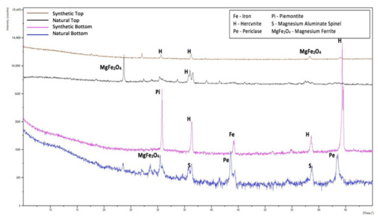 The Streeter–Diehl–Schobert, Watt–Fereday, and S2 models provided promising results above 1370 °C according to Zhao et al. [12]. Watt–Fereday model is suitable for petcoke samples with greater than 80% SiO2 in the ash. Petcoke A ash has a significantly lower amount at 17%, and is thus not suitable. Becerra et al. [16] reported that the Watt–Fereday model produced very poor estimates, confirming this notion. The Kondratiev and Jak model relies on network modifiers but as there is uncertainty in whether Fe and Al behaved as network modifiers or network formers, full confidence cannot be placed in the accuracy of the model. Hercynite (FeAl2O4) was identified to be a major phase in synthetic and natural petcoke A, as seen in Figure 3. Nowok [17] acknowledged its formation under reducing environments where no other specific cases have been reported in the literature regarding this. However, Kaneko et al. [18] also reported hercynite as a major crystalline phase for synthetic coal/petcoke blends. FeAl2O4 belongs to the spinel group minerals that have the formula A2+B23+O4. However, Jastrzębska et al. have reported the presence of both Fe2+ and Fe3+ in their study [19]. Fe3+ and Al3+ are amphoteric and Fe2+ is a network modifier [15].