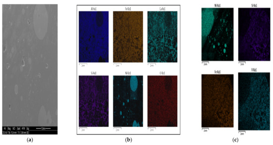 The mass of solid phases that FactSage predicted for petcoke A over the entire temperature range remained fairly constant (see Table 2). Coulsonite (FeV2O4) formed in a reducing environment with a low V2O5 content, as reported by Li et al. [25]. Although it was not identified via XRD analysis, it was noted to be a possible spinel species from EDS analysis for synthetic samples (see Figure 6c), which can be confirmed via its prediction from FactSage. Solid Ni was identified to be a prominent phase via SEM and EDS analysis for both samples. See Figure 6 for an example of elemental analysis showing solid Ni as a prominent phase. It was confirmed via FactSage that solid Ni formed under reducing conditions, whereas Wang et al. [26] confirmed this phenomena occurs between 1100 °C and 1400 °C.