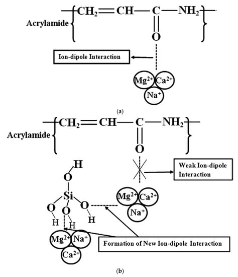 (a) Proposed interaction between magnesium, sodium and calcium cations with the carbonyl group of PAM solution without silica nanoparticles; (b) Weakened ion-dipole interaction with carbonyl group of PAM with the presence of silica nanoparticles due to the formation of new bonds with the nanoparticles [32].