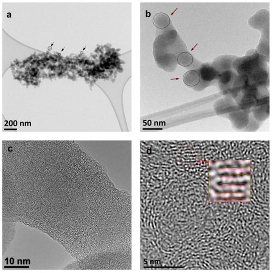 Multiscale organization of the young methane soot structure. TEM images obtained at different magnifications, as indicated by the reported scales (a–d) Black arrows in (b) indicate spherical soot particles. Red lines in (d) indicate the parallel arrangement of the defected carbon layers.