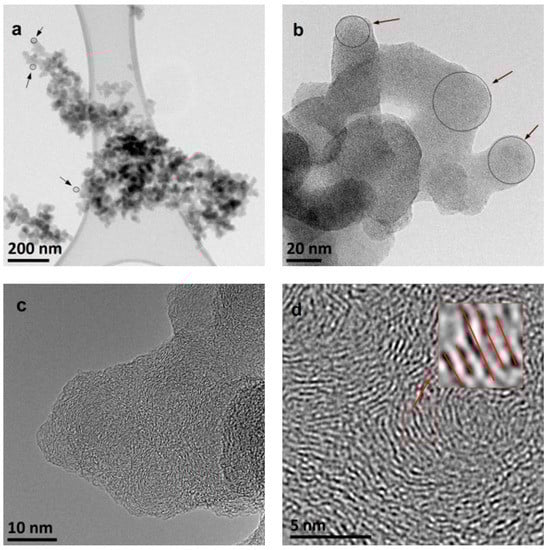 The TEM and HRTEM images of young ethylene and methane soot are reported in Figure 2 and Figure 3, respectively. The images, reported at different magnifications, confirm the characteristic, multi-scale structure of the soot in the two tested samples, showing different aggregates made of smaller particles. Aggregates composed of single particles and containing thousands of such particles were observed (Figure 2a and Figure 3a). It was a characteristic property of the tested samples, depending on the selected fragment of the observed sample, small or large aggregates were visible.
