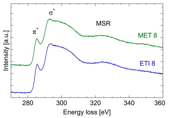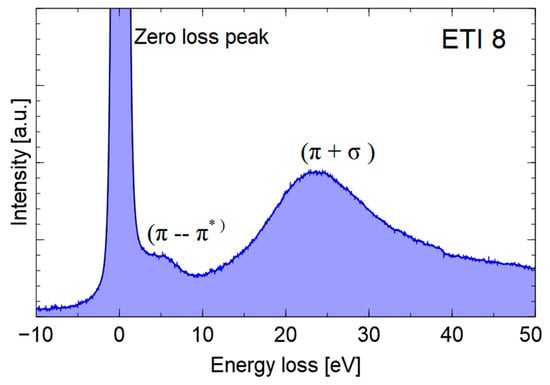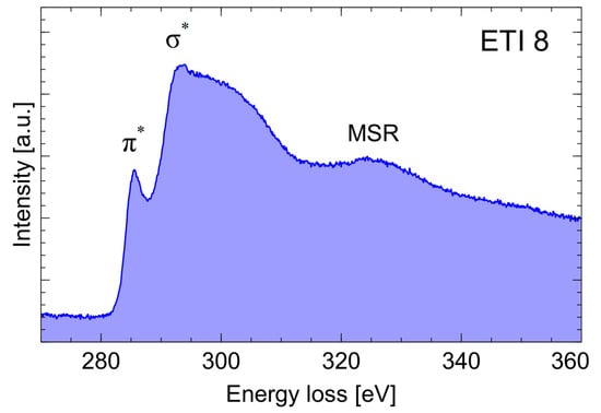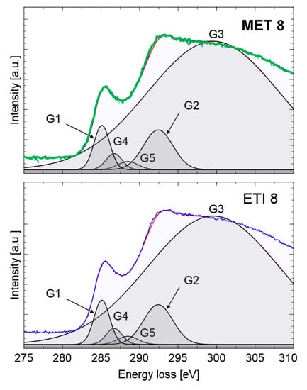 For such volumes, the carbon layers are anisotropically arranged (in all directions, there is no privileged orientation). An EELS energy resolution, measured as the full width at half maximum (FWHM) of the Zero Loss Peak (ZLP), was 1.8 eV. Energy loss spectra were recorded in two ranges: low energy losses (<50 eV) and core loss (270–360 eV). Six spectra were recorded for each sample. For spectral deconvolution, the FITYK program was used [17].