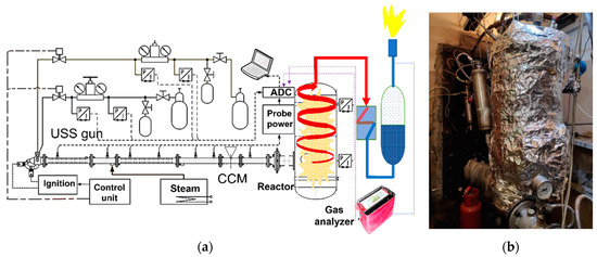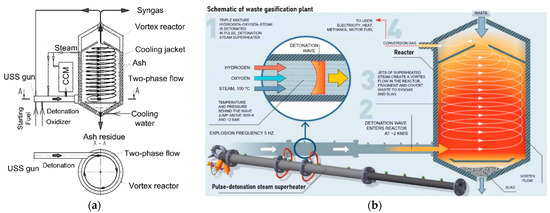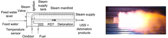 In our patent [39], we proposed a new method and devices for obtaining USS with temperatures above 2000 °C at atmospheric pressure, in which the problems of thermal insulation of combustion devices and reactors are solved by substituting conventional combustion by detonation in a pulse- or continuous-detonation steam superheaters (so-called pulsed or continuous USS guns) by means of cyclic or continuously rotating gaseous detonations of ternary fuel gas–oxidizer–steam mixture. Detonation is the transformation of the matter due to overall exothermic self-accelerating chemical reactions induced by volumetric compression and heating in strong self-sustaining shock waves (SWs). So far detonation of high explosives was primarily used for disposal of hazardous wastes like explosives and highly reactive materials (nitrocompounds, organic peroxides, etc. [40]). In patents [41,42], the novel gasification technologies based on pulsed USS guns are applied to USS gasification of CCMs [41] and to fly ash decontamination [42]. The fundamentals of gaseous and spray detonations and the operation principles of pulse-detonation and continuous-detonation combustors for propulsion purposes were reviewed in [43] and [44], respectively. Syngas, H2, natural gas, C3H8, etc. can be used as fuel gas, while pure air, O2, or air enriched with O2 can be used as oxidizer.