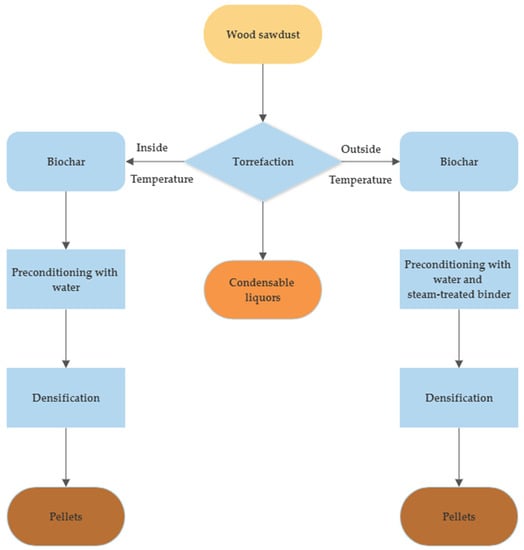 When huge volumes of wood pellets are kept in silos or containers for long periods, some incidents such as self-ignition burning and accidental fire may occur []. Torrefaction of the wood may offer solutions to address the biological and thermal decomposition of wood pellets during storage. Torrefaction is the thermal treatment of biomass in an inert atmosphere and at relatively low temperatures (between 200 and 300 °C). Although mechanical structures are weakened via torrefaction, roughly 90% of the chemical energy is still retained []. The ultimate focus of torrefaction in biofuel processing is to maximize the energy density of wood residues while reducing their water absorbency []. Along with producing high-quality biofuels, torrefaction can be implemented in pyrolysis treatment as well [,,]. Torrefaction produces liquid and gaseous by-products in addition to solid biochars [].
