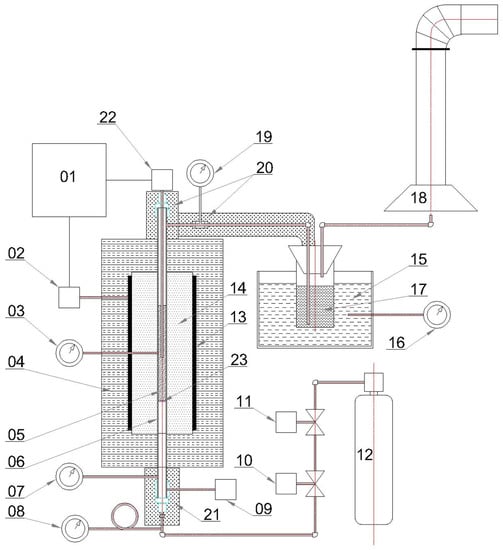 Schematic representation of the batch torrefaction unit (BTU), adapted from []. 1: Indicating temperature controller; 2: Temperature control element; 3, 7, 8, 16 and 19: Local temperature gauges; 4: Insulation; 5: Wood sample; 6: Tube reactor; 9: Time-base temperature controller; 10: Mass flow-rate controller; 11: Pressure regulator; 12: Nitrogen tank; 13: Conduction heaters; 14: Furnace heating zone; 15: Ice-NaCl bath; 17: Torrefaction liquor; 18: Fume hood; 20 and 21: Heating tape; 22: Thermocouple; 23: Porous metal distributor.