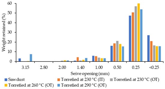 Following torrefaction, fibre diameters had not changed much, and the average was around 0.3 mm (Table 3). A trivial increase in dgw (0.38 mm) after the ultimate treatment may be attributed to the agglomeration of particles at the highest temperature (290 °C). This was also evident in Figure 3, showing a small percentage of coarse particles on the left side of the chart and major fine particles on the right side for torrefied and raw sawdust.