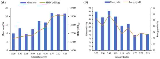 Relationship between mass loss and higher heating value with severity factor (A); and mass and energy yield with severity factor (B) of torrefaction process using inside temperature.