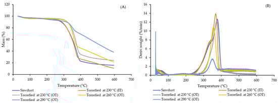 Results of thermogravimetric analysis (TGA) are shown in Figure 5. Most of the mass reduction in raw and torrefied samples was between 300–400 °C, except for extremely torrefied sawdust (at 290 °C), which revealed a milder slope on the TG curve (Figure 5A). This was confirmed by the differential thermogravimetric (DTG) graph in Figure 5B as well, where roughly 40% of this sample was removed between 400–600 °C, while other samples showed a maximum decomposition rate at lower temperatures. The broad range of lignin decomposition (between 250–500 °C) for torrefied samples at 290 °C agreed with previous studies [,,]. There was a left shoulder observed at around 300 °C for raw sawdust and less severe torrefied sample (230 °C, IT), which may be related to degradation of hemicelluloses [,]. This finding was in agreement with the results of Table 4 in that only these two samples contained high amounts of hemicellulose.