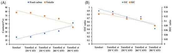 Proximate analysis (A) and oxygen/carbon, hydrogen/carbon ratios of wood sawdust before and after torrefaction (B).