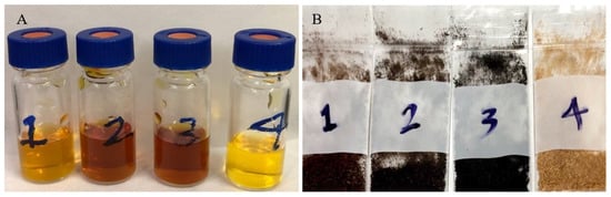 After each run, the biochar along with torrefaction liquid (Figure 7) was collected and sealed for further analysis. The GC/MS analysis was carried out to determine the main components of torrefied liquid by-products. As shown in Figure 7B, a change of colour from yellow to dark brown took place which corresponded to torrefaction levels from low to extreme. The colour change during torrefaction of wood residues has been reported in the literature [,,] and it was a result of the lignin conversion from heating woody biomass [,]. According to the results of Yue and co-workers, even at high torrefaction temperatures most lignin and cellulose in biomass were more resistant and gradually degraded []. Eventually, they were decomposed and accumulated into acid-insoluble compounds. The current study revealed that the pH of torrefaction liquids was extremely acidic (1.85, 1.75, 1.76 and 2.35 corresponding to numbers 1–4, respectively in Figure 7A).