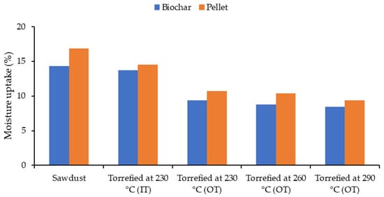 Figure 9 shows a linear relationship between moisture absorption and severity of the torrefaction experiments. As sawdust was subjected to a higher torrefaction temperature, the amount of moisture that it could retain decreased from 14 to 8% for resultant biochars. A justification is that the hydroxyl groups have been steadily removed from biomass [,]. The torrefied pellets could take slightly more moisture than their originating biochars (around 1–2%). This might be due to the addition of 20% binder (steam-treated) which could increase the functional groups of the feedstock and consequently, more hydrogen bonds could be created with water. These results match with the results of Peng et al. [] showing that torrefied pellets after the moisture absorption tests contained 12% moisture, which was lower than the control but higher than pellets without binder [].