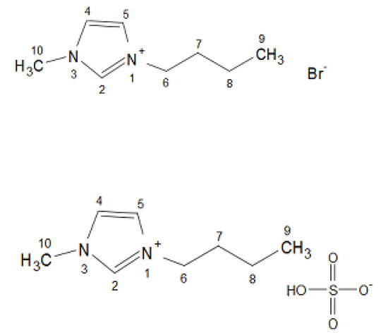 The chemical structures of the ionic liquids [BMIM][Br] and [BMIM][HSO4] are shown in Figure 1 [45].
