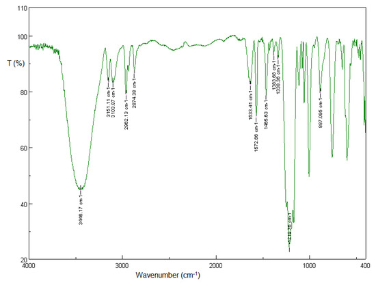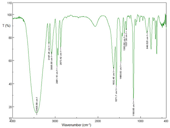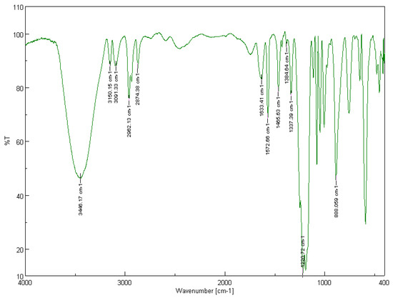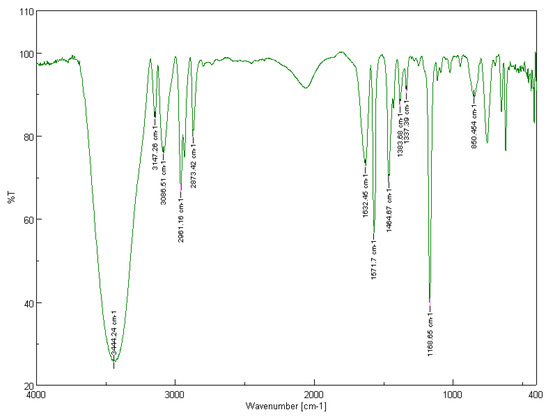 Solid-state FT-IR spectrum of the fresh [BMIM][Br]. Sample pellet with KBr, number of scans: 32, resolution: 4.0 cm−1 [45].
