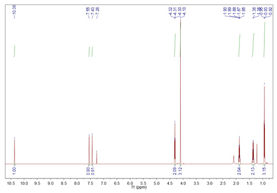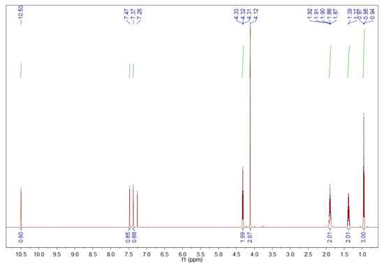 1-Butyl-3-methylimidazolium bromide ([BMIM][Br]). 1H NMR (600 MHz, CDCl3) δ (ppm): 10.50 (s, 1H, H-2 methine proton), 7.47 (s, 1H, H-4 methine proton), 7.37 (s, 1H, H-5 methine proton), 4.32 (t, J = 7.4 Hz, 2H, H-6 methylene protons), 4.12 (s, 3H, H-10 methyl protons), 1.93–1.86 (m, 2H, H-7 methylene protons), 1.42–1.34 (m, 2H, H-8 methylene protons), 0.95 (t, J = 7.4 Hz, 3H, H-9 methyl protons). The 1H NMR spectrum of the fresh [BMIM][Br] is shown in Figure 4 [45].